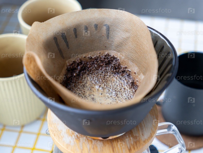 Кофе изготавливается из кофейных зерен. человек делает кофе через бумажный фильтр, наливает или капает