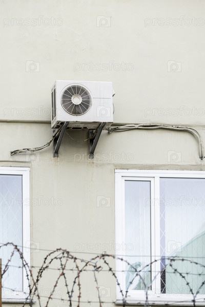 Кондиционер на фасаде здания, охлаждение воздухом в жаркую погоду