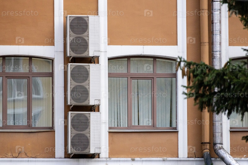 Кондиционер на фасаде здания, охлаждение воздухом в жаркую погоду