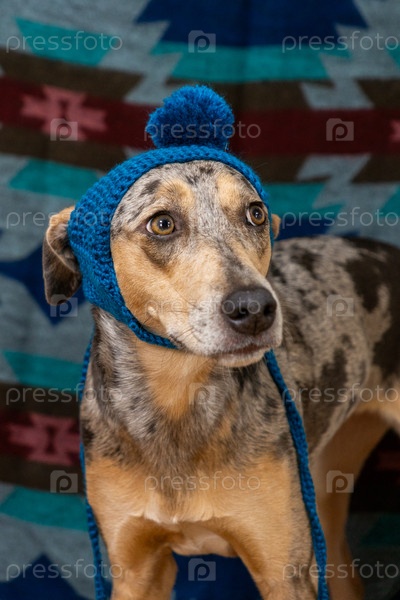 Пятнистая собака с грустным лицом в синей шляпе с помпоном и перчатками на лапах