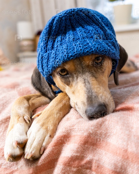 Пятнистая собака с грустным лицом в голубой вязанной шляпе сидит на кровати и смотрит в камеру