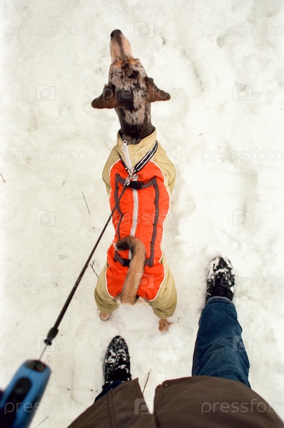 Вид сверху собаки в зимнем комбинезоне, стоящей на снегу со своим хозяином