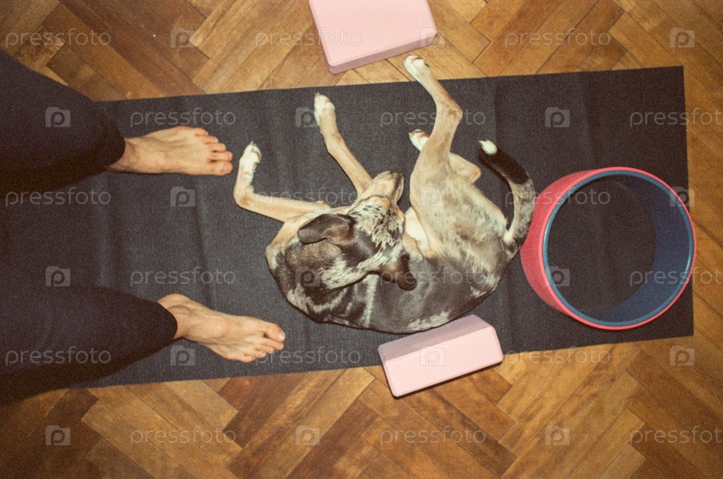 Вид сверху. мужчина стоит на коврике для йоги и занимается фитнесом со своей собакой. заботятся о домашнем питомце