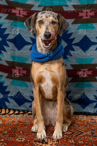 Пятнистая собака с грустным лицом и голубым вязанным шарфом вокруг шеи сидит на кровати и смотрит в камеру