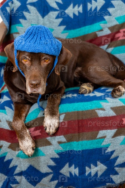 Собака лабрадор ретривер лежит на стуле в синей вязаной шляпе