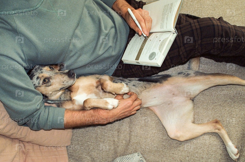 Человек читает книгу или записывает записи в дневник, лежа на кровати со своей собакой. заботясь о домашнем питомце