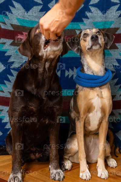 Две собаки на цветном фоне, домашние животные сосредоточены и смотрят в сторону