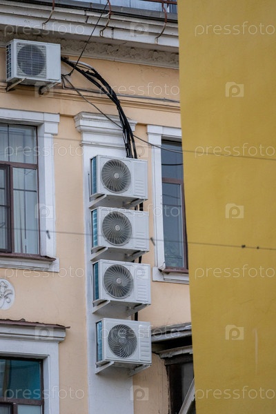 Кондиционер на фасаде здания, охлаждение воздухом в жаркую погоду