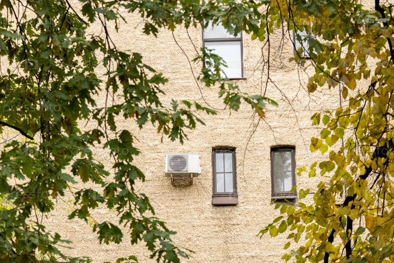 Кондиционер на фасаде здания, охлаждение воздухом в жаркую погоду