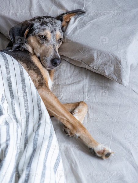 Пятнистый пес спит в постели под одеялом. питомец отдыхает после прогулки. очаровательная собака в кровати