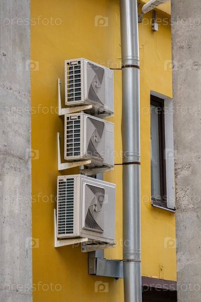 Кондиционер на фасаде здания, охлаждение воздухом в жаркую погоду
