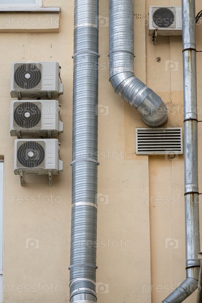 Кондиционер на фасаде здания, охлаждение воздухом в жаркую погоду