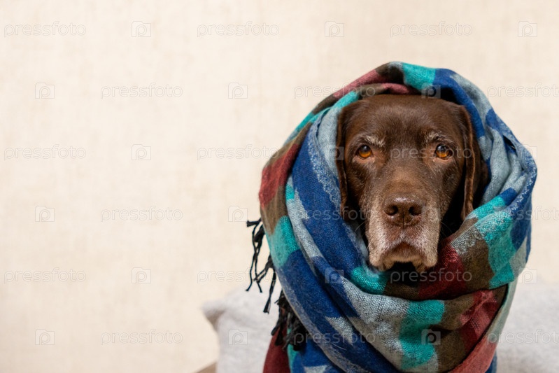 Собака лабрадор ретривер сидит на стуле, завернутая в одеяло