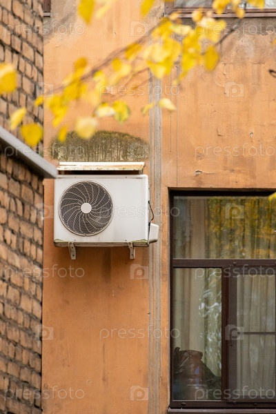 Кондиционер на фасаде здания, охлаждение воздухом в жаркую погоду