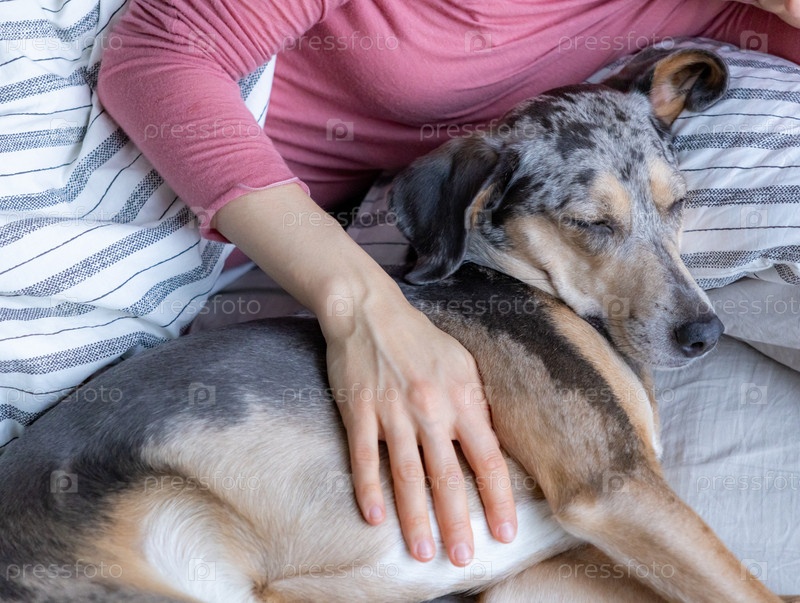 Молодая женщина спит с пятнистой собакой на кровати, девочка и собака спали комфортно вместе