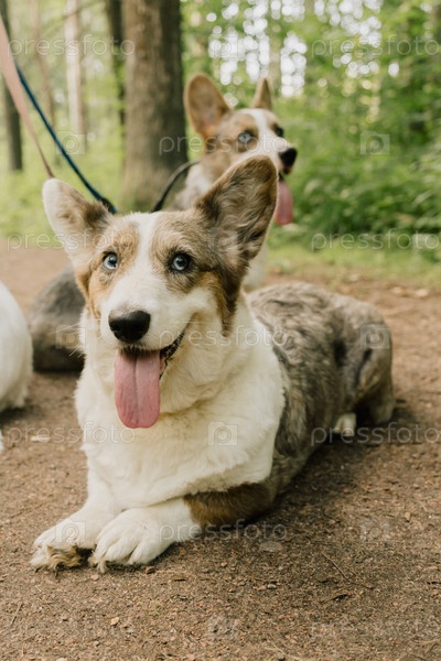 Кардиганский валлийский корги на прогулке в парке с хозяином, собака лежит на траве со свисающим языком