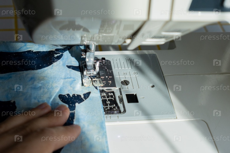 Человек шиет продукт, сделанный из синей ткани на швейной машине. портной сосредоточен на работе, спокойное расслабленное настроение