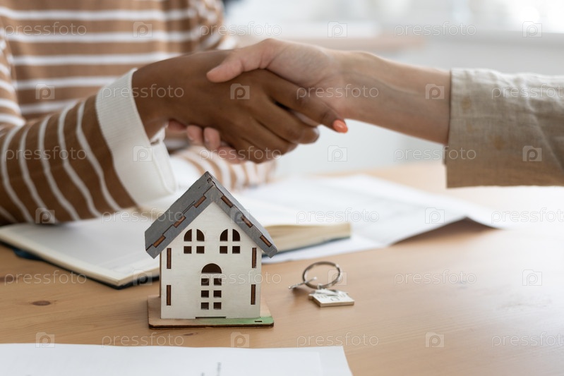 Рукопожатие между двумя людьми, заключение договора продажи недвижимости