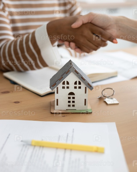 Рукопожатие между двумя людьми, заключение договора продажи недвижимости