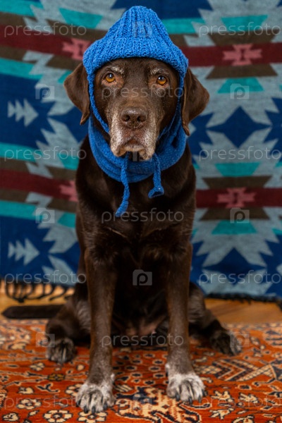 Лабрадор ретривер собака в голубой шляпе и шарфе сидит на полу с грустным лицом на цветном фоне