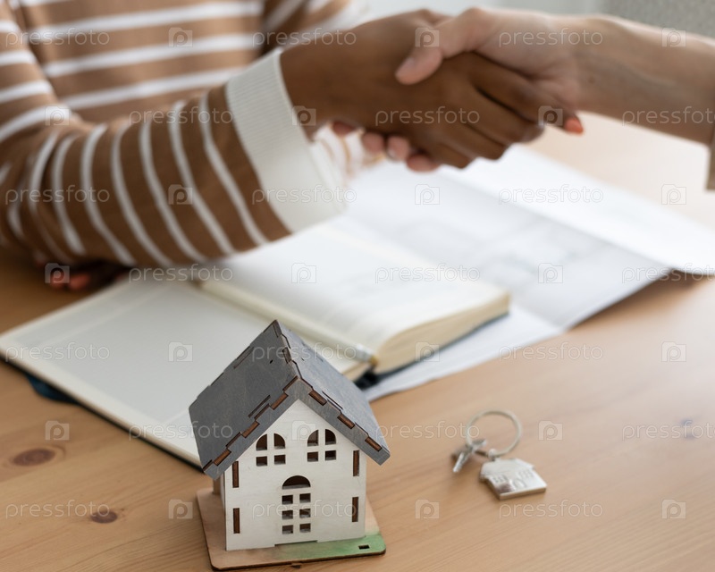 Рукопожатие между двумя людьми, заключение договора продажи недвижимости