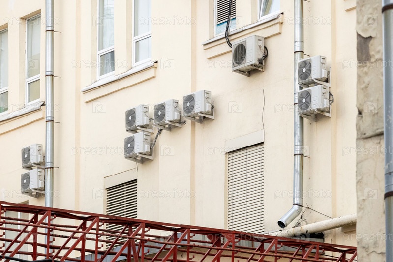 Кондиционер на фасаде здания, охлаждение воздухом в жаркую погоду