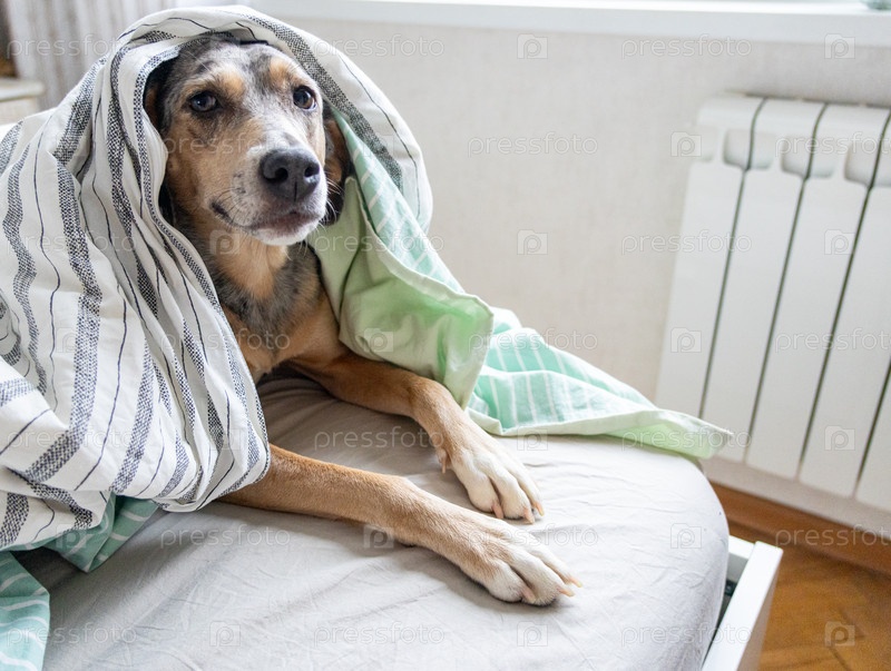 Пятнистая собака лежит на кровати под одеялом на фоне радиатора
