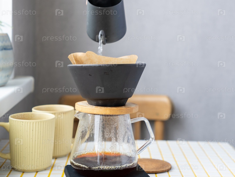 Кофе изготавливается из кофейных зерен. человек делает кофе через бумажный фильтр, наливает или капает