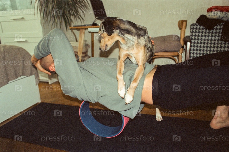 Мужчина занимается спортом дома на черном коврике для йоги, собака встает на пути своего хозяина и прыгает на него