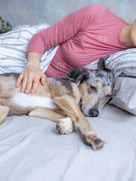Молодая женщина спит с пятнистой собакой на кровати, девочка и собака спали комфортно вместе