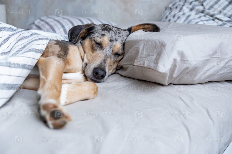 Пятнистый пес спит в постели под одеялом. питомец отдыхает после прогулки. очаровательная собака в кровати