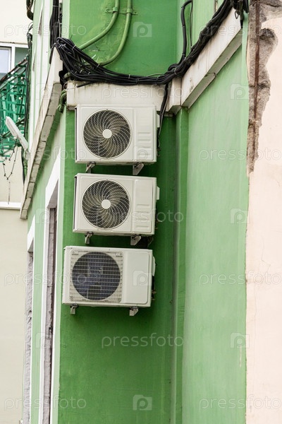 Кондиционер на фасаде здания, охлаждение воздухом в жаркую погоду