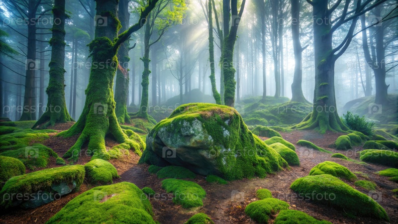 Завораживающий лесный пейзаж, покрытый мохом, купается в утреннем тумане