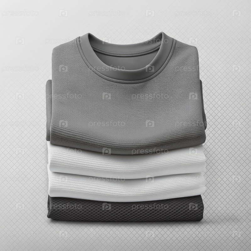 Стол сложенных серо-белых футболок на белом фоне