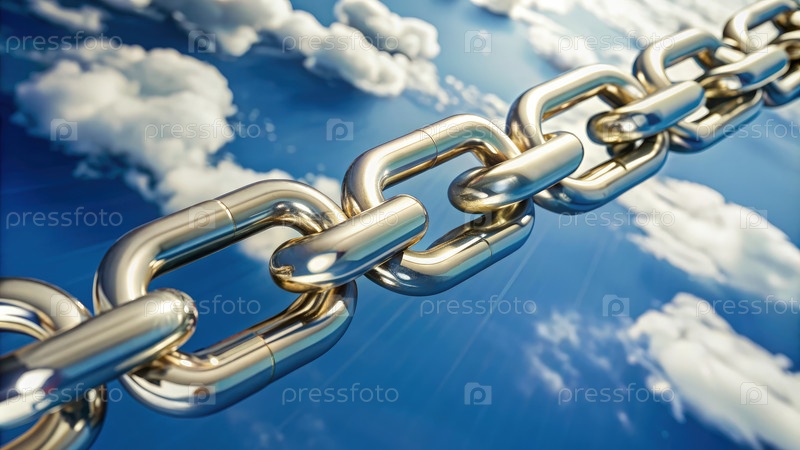 Ближайшее изображение диагональной цепи, представляющей концепцию блокчейна против облачного неба