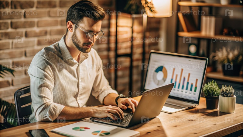 Маркетинговый аналитик, работающий над анализами данных ночью в домашнем офисе