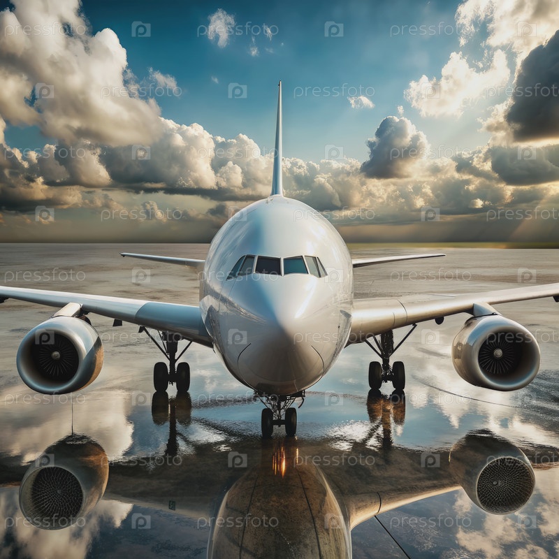 Серебряный самолет, припаркованный на мокрой взлетно-посадочной полосе под облачным небом