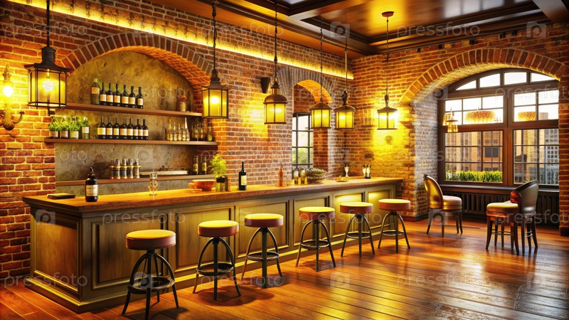 Тепло освещенный кирпичный бар с табуретками и видом на город