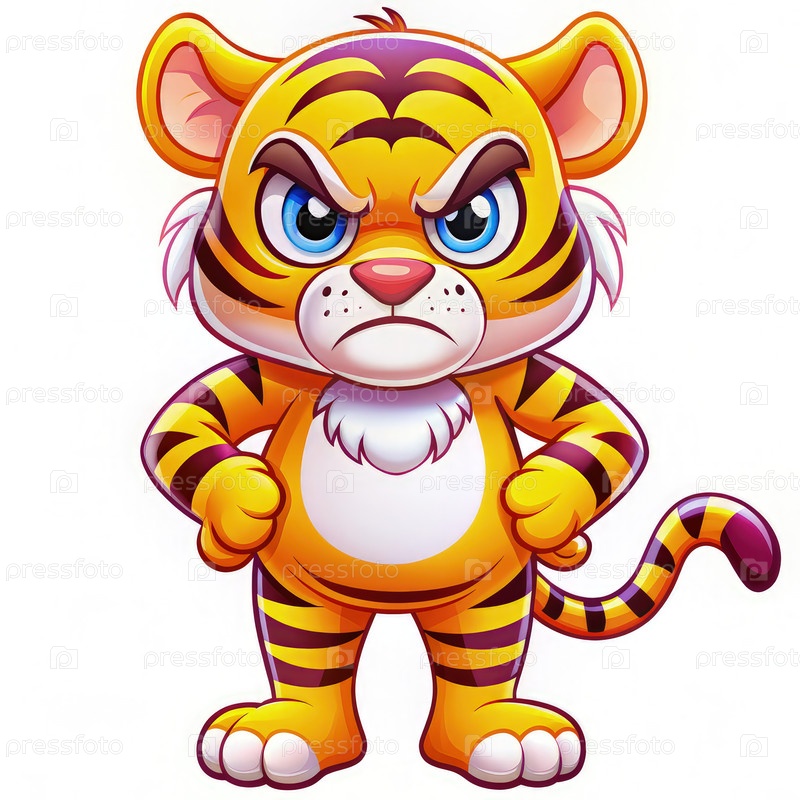 Разгневанный мультфильм Тигровое детенышко стоит с кулаками на бедрах