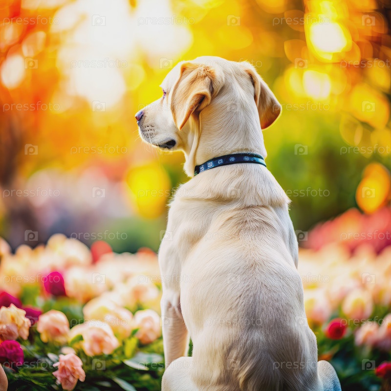 Лабрадор ретривер собака сидит в поле цветов. генеративный ИИ