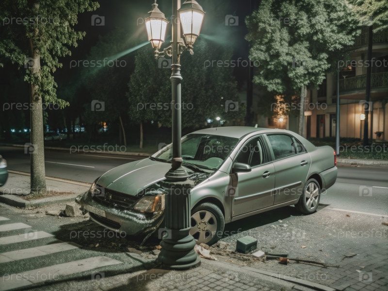 Сцена автокатастрофы ночью с повреждением уличных фонарей