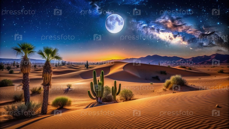 Пустынный пейзаж под полнолунием и звездным небом. генеративная ИИ