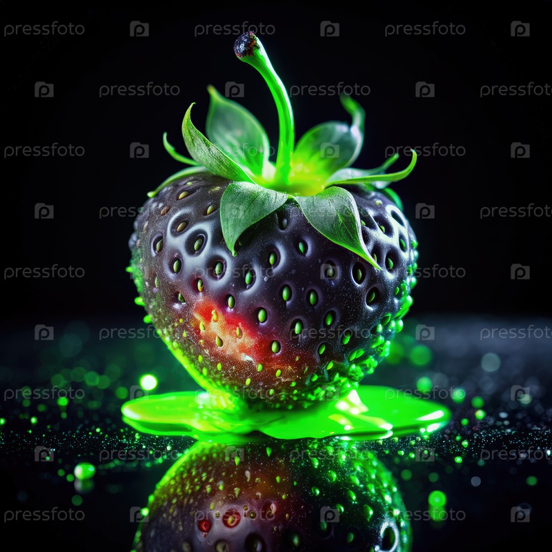 Близкая макрофотосъемка черной клубники с зеленой капельной жидкостью