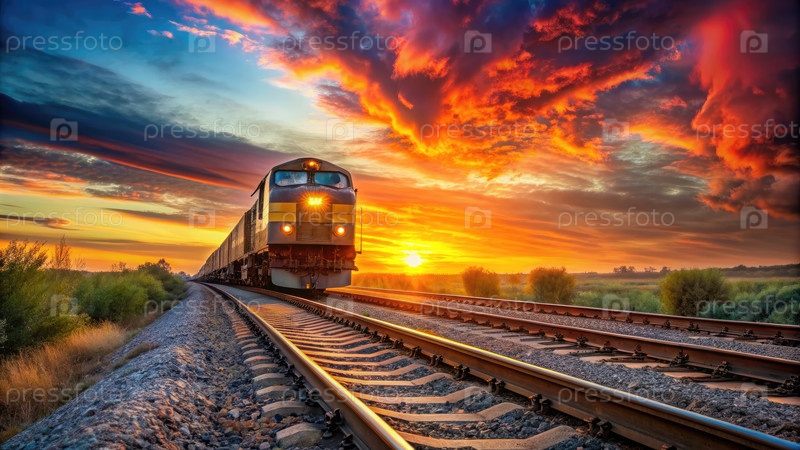 Грузовой поезд, путешествующий по ландшафту захода солнца. генеративный ИИ