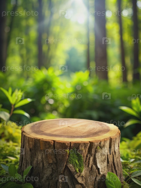 Пустой деревянный пьедестал на стволе дерева в пышном лесу
