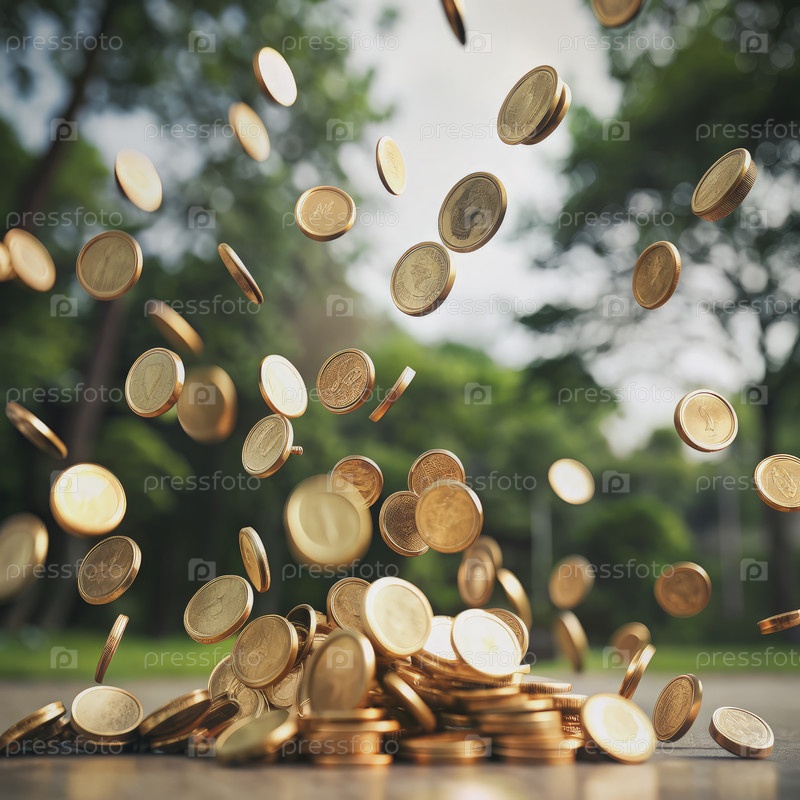 Золотые монеты падают на тротуар перед пышной зеленью