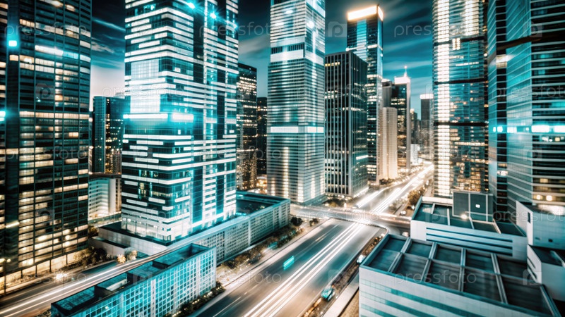 Освещенные небоскребы и дорожные пути в ночном городском пейзаже