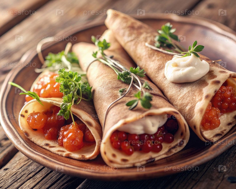 Треугольные блины, заполненные кислой смесью и облачными ягодами на деревянном столе