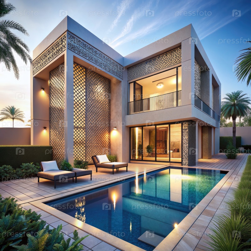 Арабский дом с бассейном на рассвете. генеративный современный ИИ