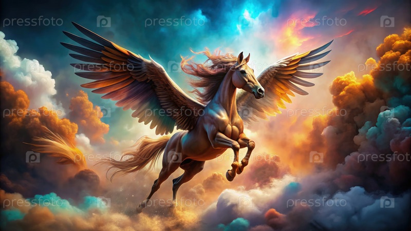 Величественный коричневый пегас, взлетающий сквозь красочные облака